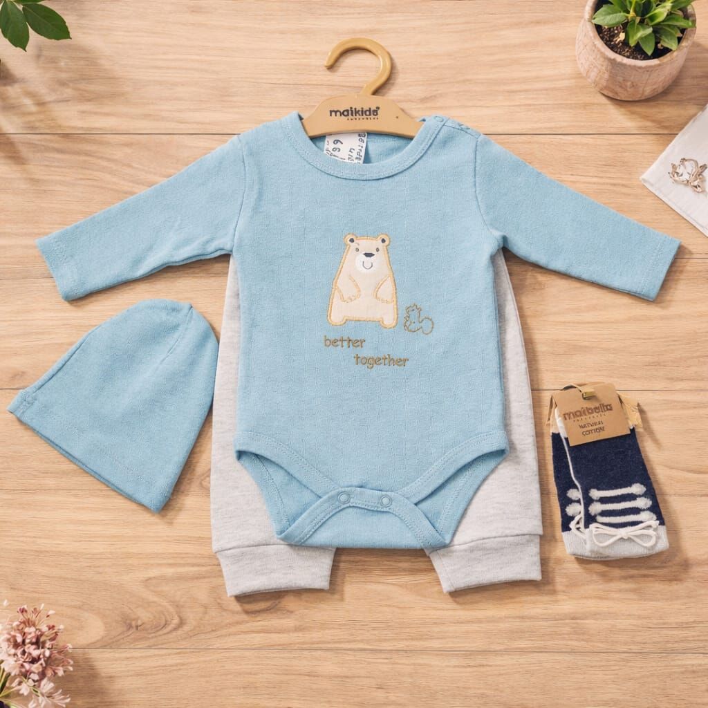 Şık ve tamamlayıcı parçalarıyla öne çıkan bu 4’lü bebek takımı; uzun kollu body, pantolon, şapka ve çoraptan oluşmaktadır. Mavi uzun kollu body üzerinde yer alan sevimli ayıcık baskısı ve “better together” yazı detayı takıma tatlı bir görünüm kazandırır.
