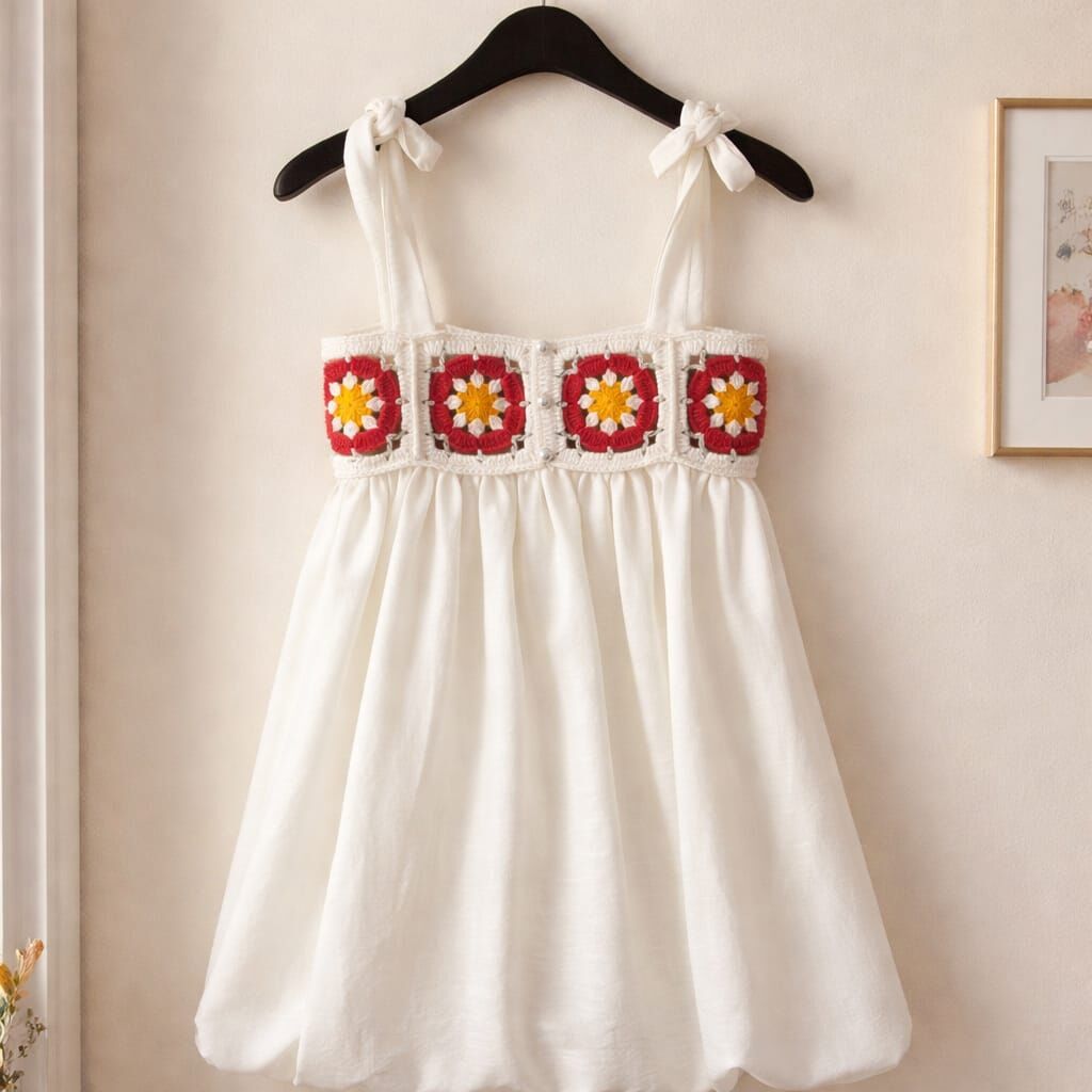 El Yapımı Özel Tasarım Motifli Beyaz Elbise