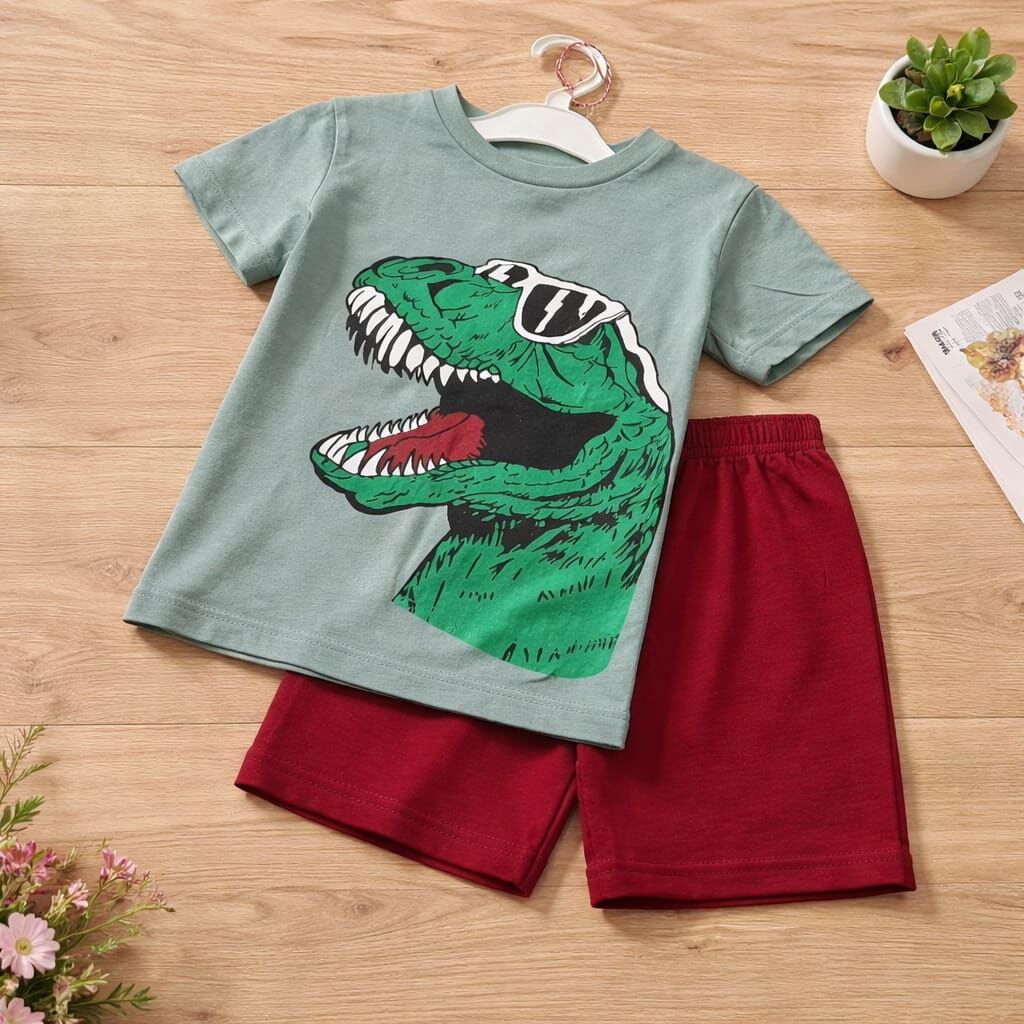 Eğlenceli ve dikkat çekici tasarımıyla öne çıkan bu erkek çocuk takım, baskılı tişört ve şort kombininden oluşur. Açık yeşil tonundaki kısa kollu tişörtün ön kısmında güneş gözlüklü dinozor baskısı yer alır. Büyük ve canlı grafik tasarım, ürüne enerjik ve havalı bir görünüm kazandırır.