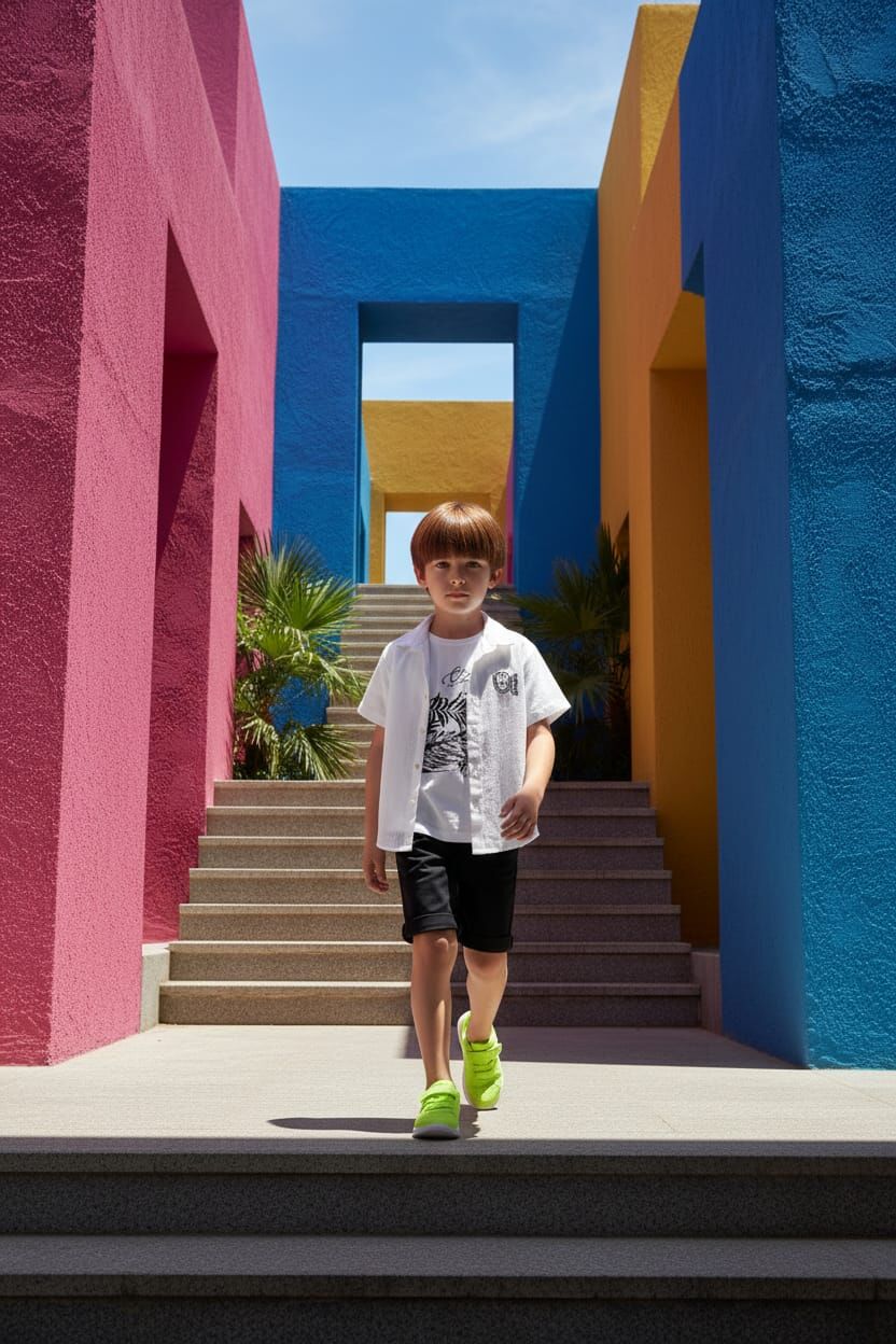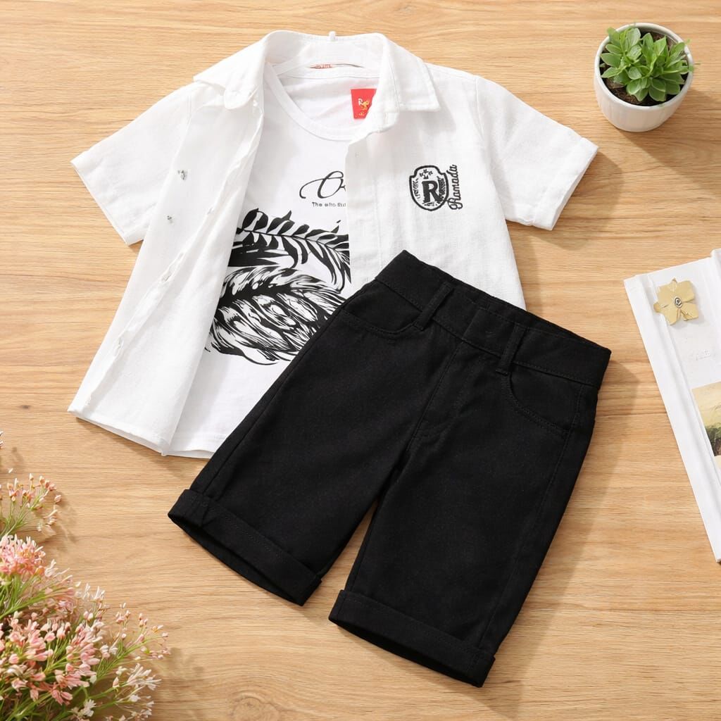 Şık ve modern tasarımıyla öne çıkan bu erkek çocuk takım, müslin gömlek, baskılı tişört ve şort kombininden oluşur.