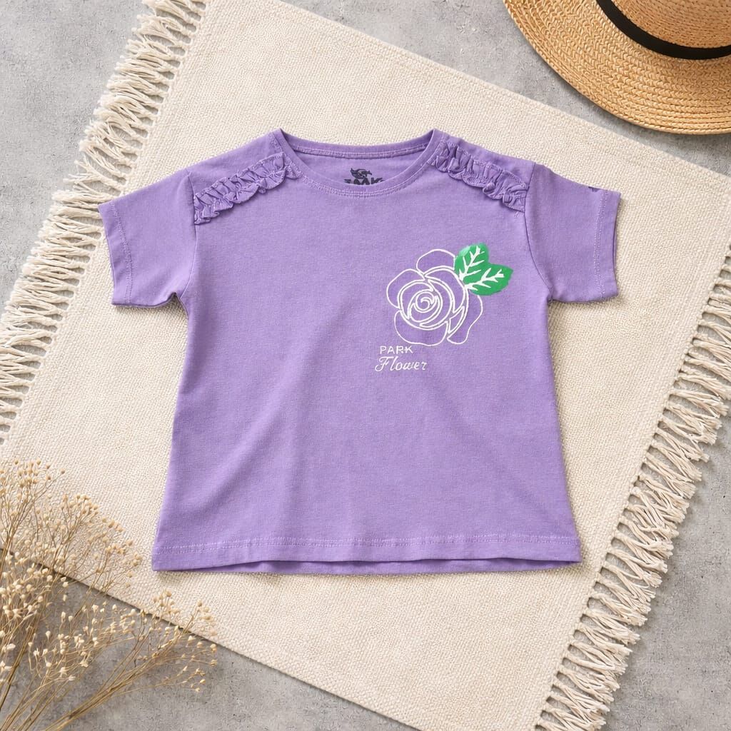 Gül Baskılı Lila Kız Çocuk Tişört – Fırfır Detaylı Şık Tasarım