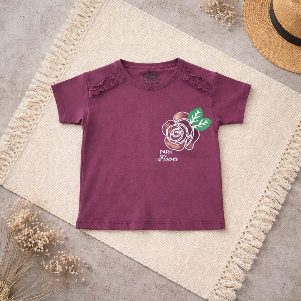 Gül Baskılı Mor Kız Çocuk Tişört – Fırfır Detaylı Şık Tasarım