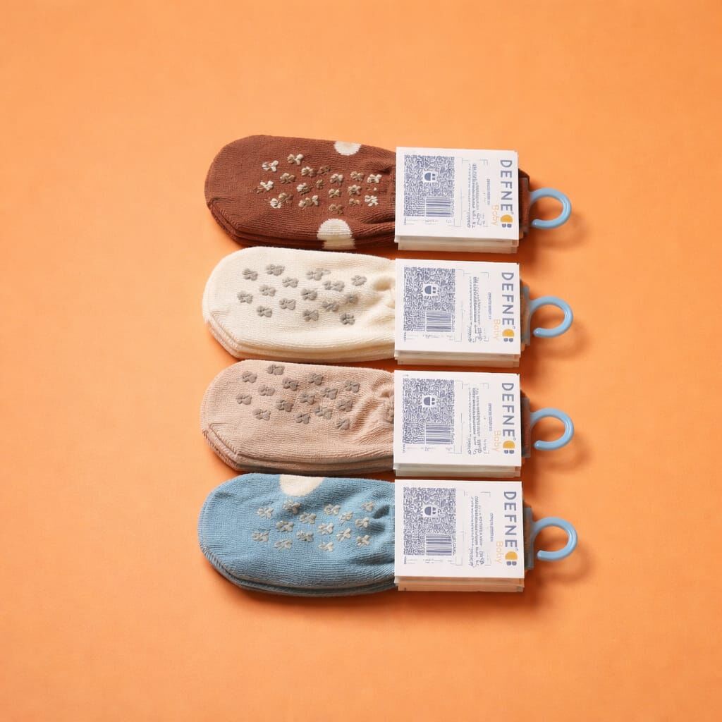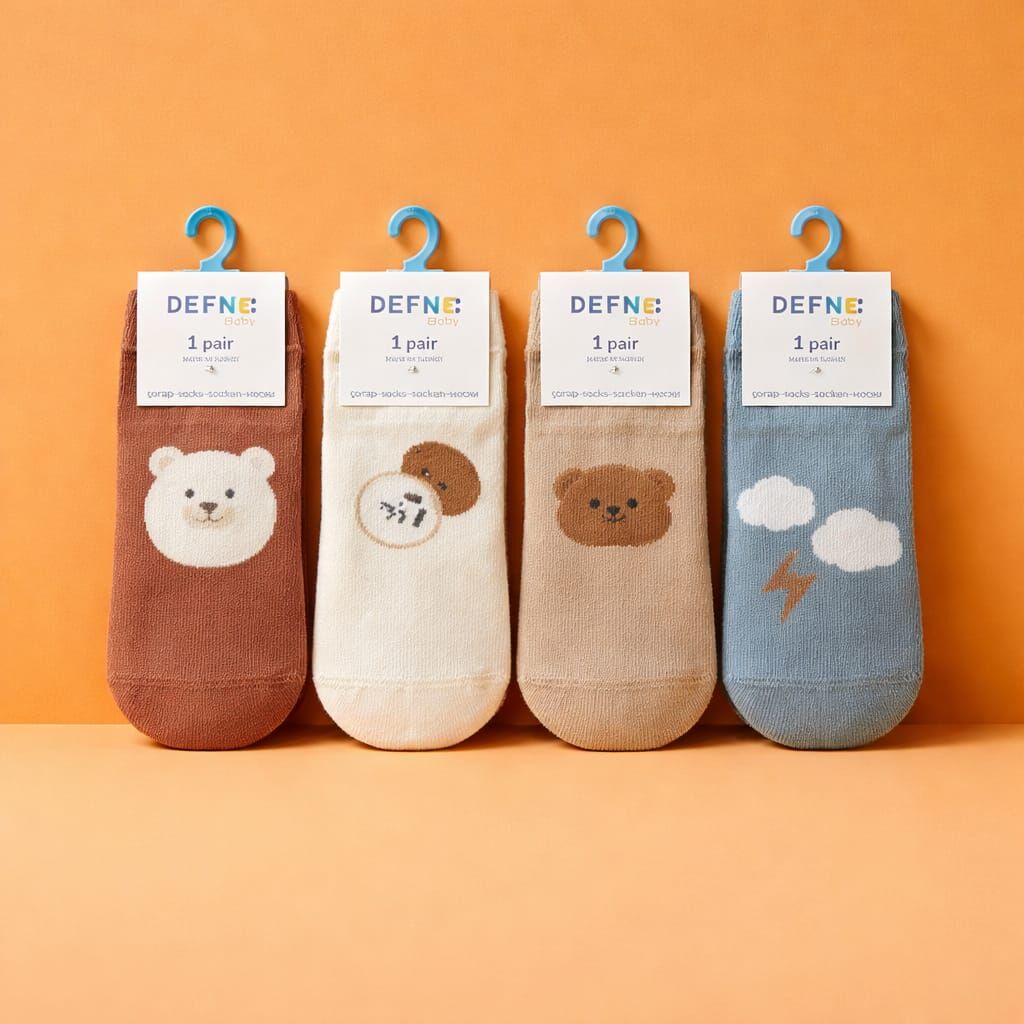 Doğal ve sade renk tonları sayesinde hem kız hem erkek çocuk kombinleriyle uyum sağlar. Güvenli, rahat ve eğlenceli tasarımıyla öne çıkan kaydırmaz tabanlı motifli çorap 4’lü set seçeneğidir.