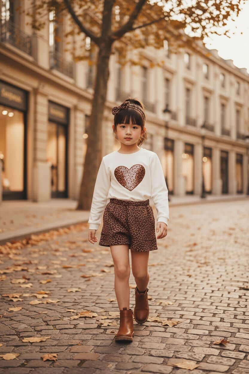 Leopar desenli etekli kız çocuk takım, şık ve uyumlu bir kombin sunan özel bir settir. Takım; kalp detaylı sweatshirt, pileli leopar desenli etek ve kombinle uyumlu taçtan oluşmaktadır. Üst kısmındaki kalp aplike tasarıma modern ve sevimli bir hava katarken, leopar desenli etek hacimli ve zarif bir duruş sağlar. Set içerisinde yer alan taç, kombini tamamlayarak bütüncül ve dikkat çekici bir stil oluşturur. Yumuşak dokulu kumaşı sayesinde gün boyu konfor sunar ve rahat hareket imkânı sağlar. Günlük kullanımda, özel günlerde ve davetlerde şık bir tercih olarak öne çıkar.