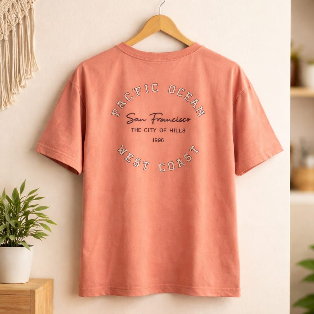 Modern ve enerjik tasarımıyla dikkat çeken bu somon renk tişört, hem ön hem arka baskı detaylarıyla öne çıkar. Arka kısmında “Pacific Ocean – San Francisco – West Coast” yazı tasarımı yer alırken, ön göğüs bölümünde minimal ölçekte “San Francisco” temalı grafik baskı bulunmaktadır.