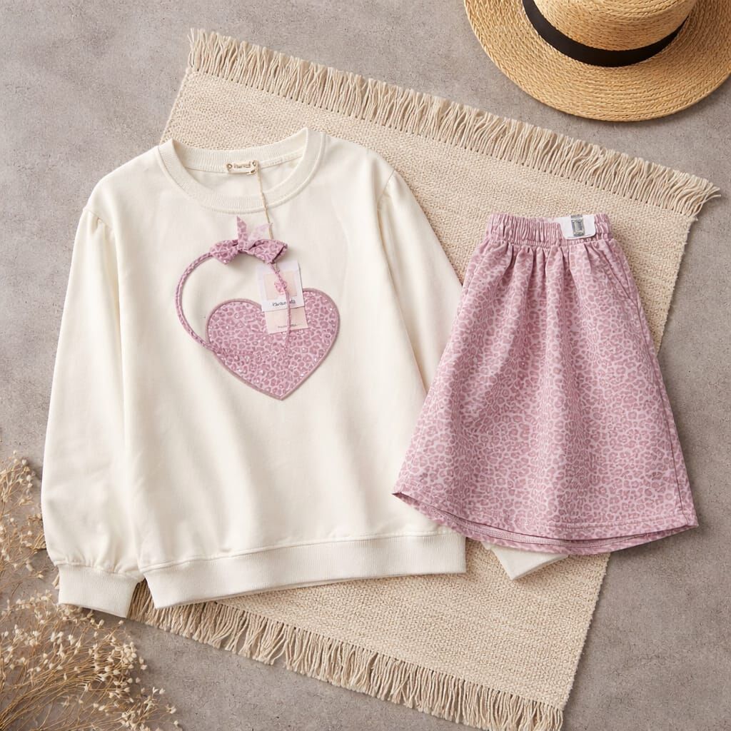 Pembe Kalp Detaylı Leopar Desenli 3’lü Kız Çocuk Takım – Sweatshirt, Etek ve Taç Seti