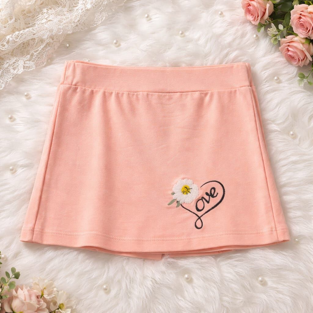 Somon Renk Love Nakışlı Kız Çocuk Şort Etek – Zarif ve Konforlu Tasarım