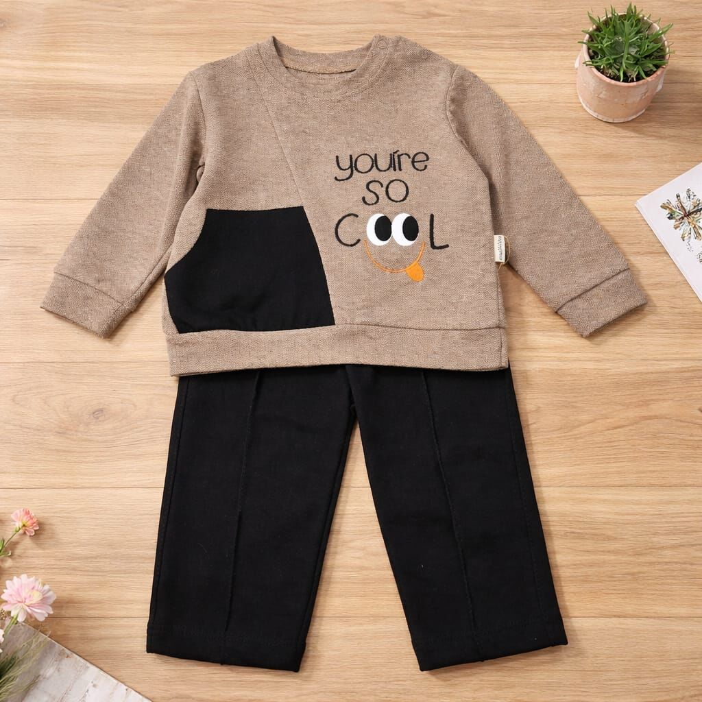 Modern tasarımı ve eğlenceli baskı detayıyla öne çıkan bu bebek eşofman takımı, “You’re So Cool” yazısı ve sevimli yüz figürüyle dikkat çeker. Bej tonlu üst parça ve siyah pantolon kombinasyonu şık ve sportif bir görünüm sunar.